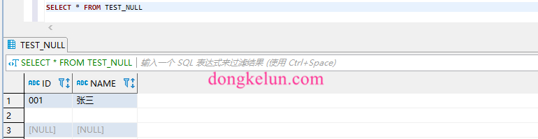 1 | INSERT INTO TEST_NULL (ID, NAME) VALUES('001', '张三'); |