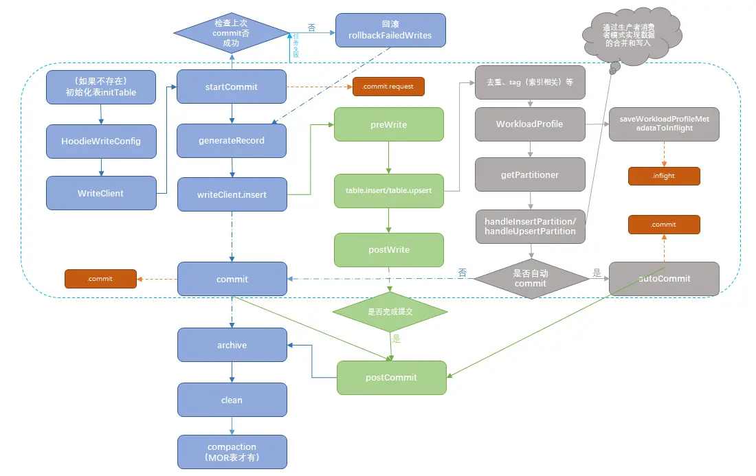 - 由于之前并没有总结tag(索引相关)和后面的写入合并逻辑(handleInsertPartition/handleUpsertPartition),并且很难在一个图中包含所有的细节,所以本流程图并不算完整。对于本图中不完整的部分我们可以借助其他人总结的流程图来辅助理解。