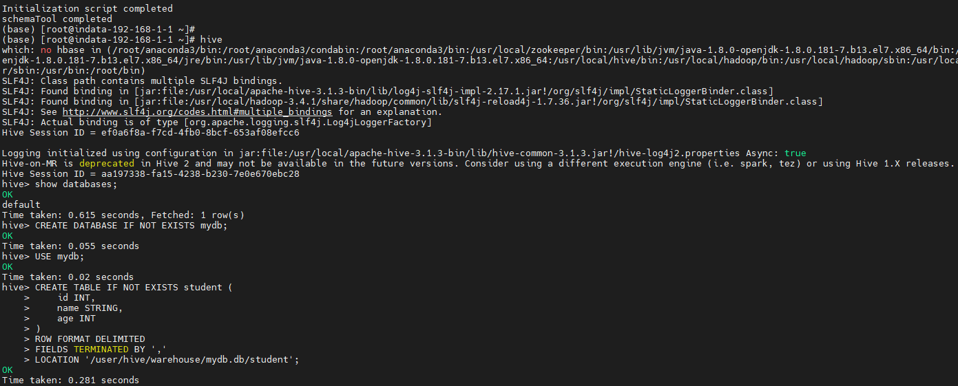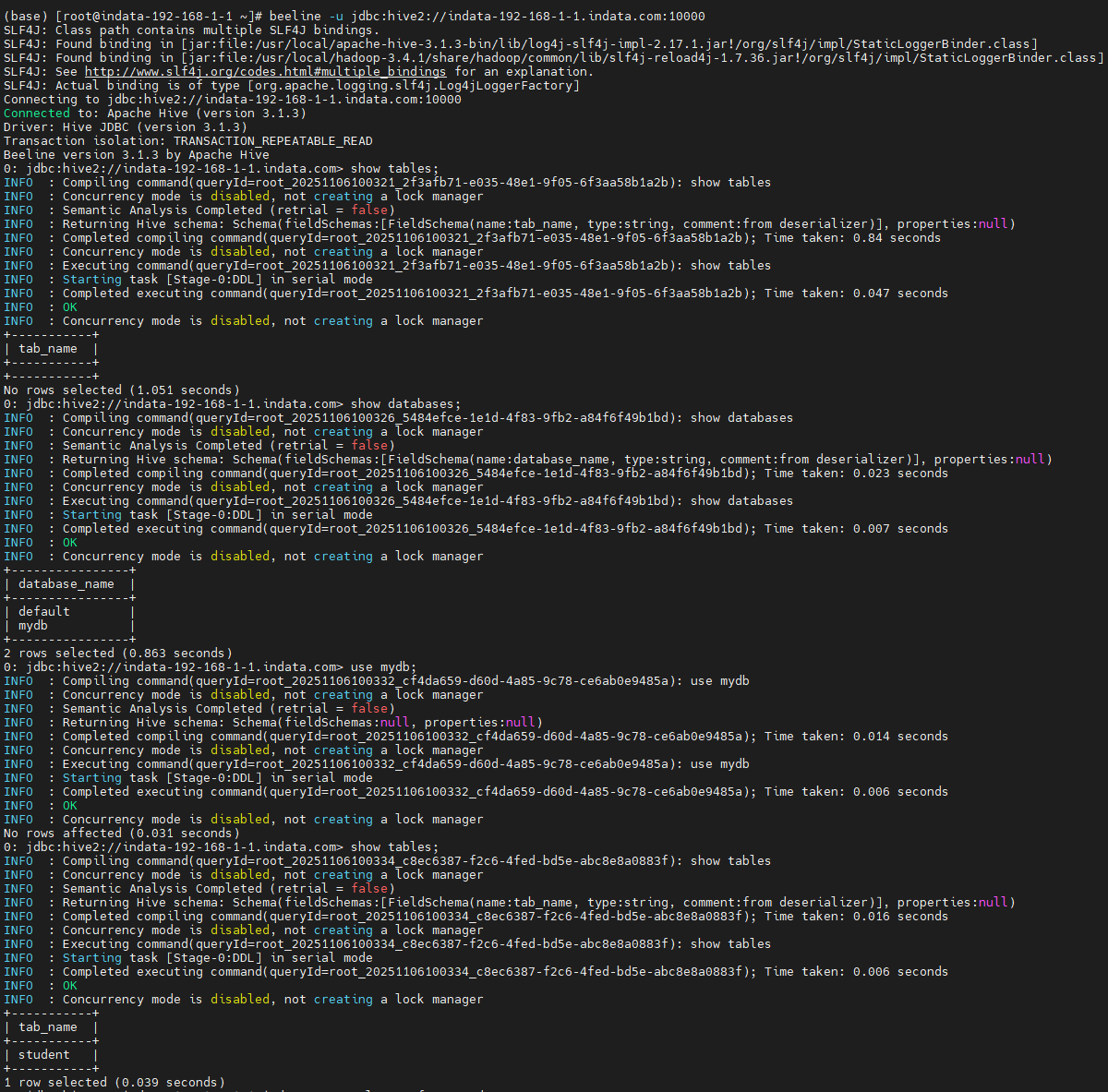 这个时候就可以用 hive 命令行连接了,之后再执行一些基本的 SQL 进行测试。