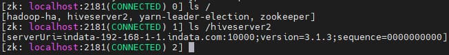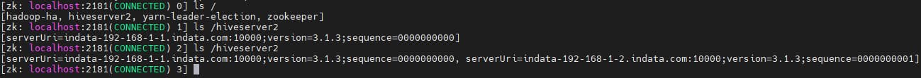 beeline -u "jdbc:hive2://indata-192-168-1-1.indata.com:2181,indata-192-168-1-2.indata.com:2181,indata-192-168-1-3.indata.com:2181/default;serviceDiscoveryMode=zooKeeper;zooKeeperNamespace=hiveserver2"