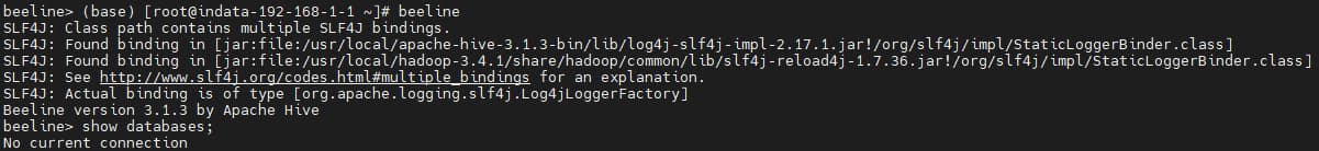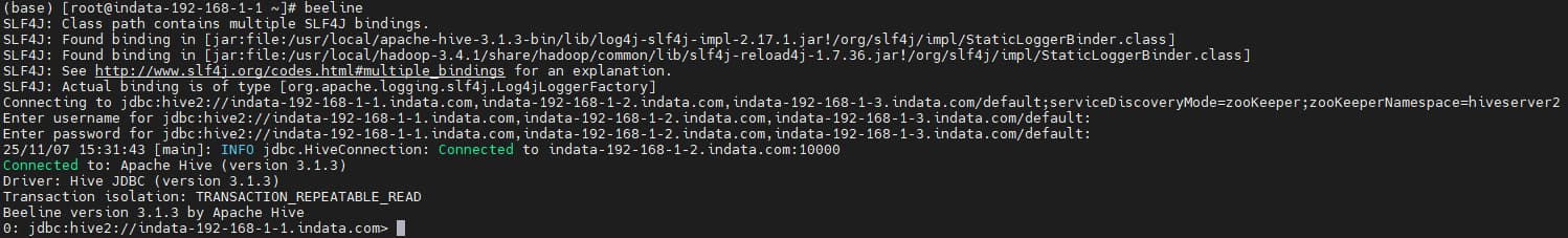 3beeline -u "jdbc:hive2://indata-192-168-1-1.indata.com:2181,indata-192-168-1-2.indata.com:2181,indata-192-168-1-3.indata.com:2181/;serviceDiscoveryMode=zooKeeper;zooKeeperNamespace=hiveserver2"